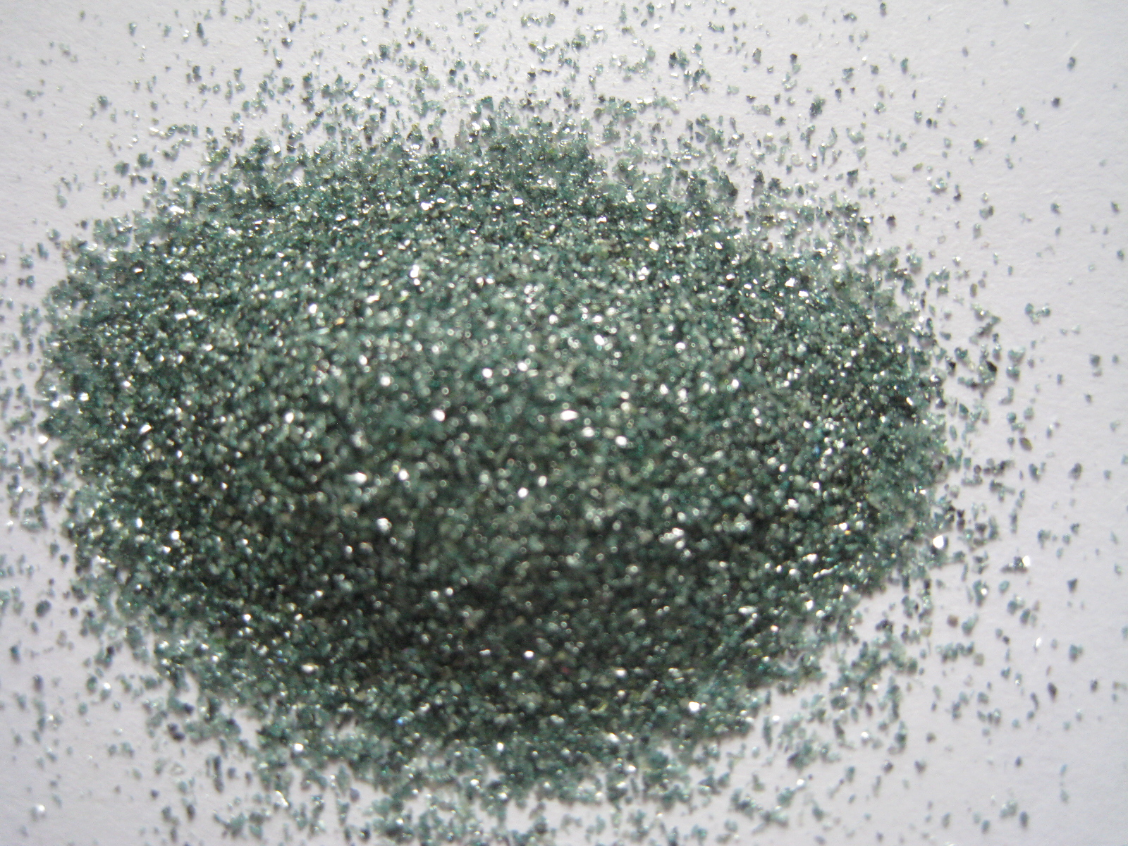 綠碳化硅是以石油焦和優質硅石為主要原料,添加食鹽作為添加劑,在電阻爐內經高溫冶煉而成。呈綠色結晶,性脆而鋒利,并具有一定的導熱性和導電性。微觀形狀呈六方晶體,碳化硅的莫氏硬度為9.3,顯微密硬度為2940—3300kg/mm2,努普硬度為2670—2815kg/mm2,在磨料中高于剛玉而僅次于金剛石、立方氮化硼和碳化硼。密度一般認為是3.20-3.25g/cm3.碳化硅磨料的自然堆積密度在1.2--1.6g/cm3之間,比重為3.20~3.25g/cm3